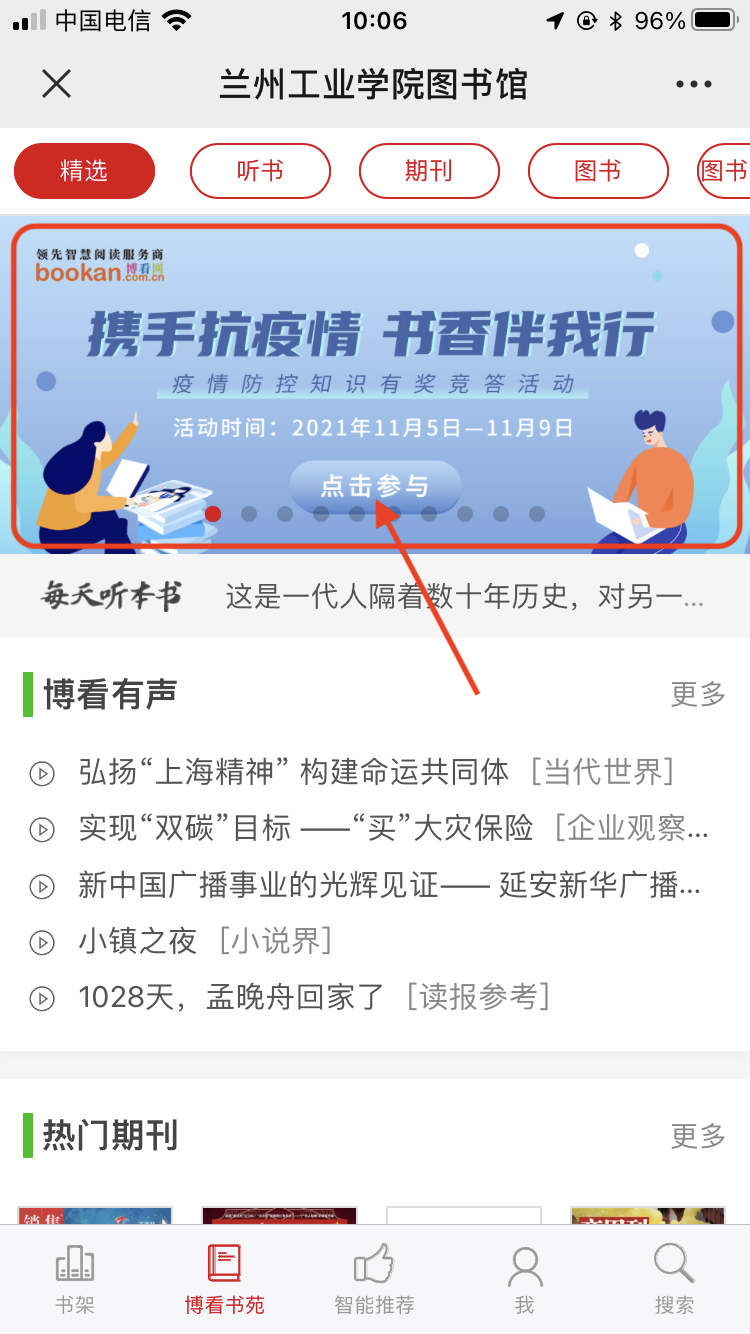 2.点击底部菜单栏“资源中心”—“博看书苑”,进入博看书苑微刊或小程序,点击首页活动轮播图,进入答题活动页面,参与线上知识竞答。