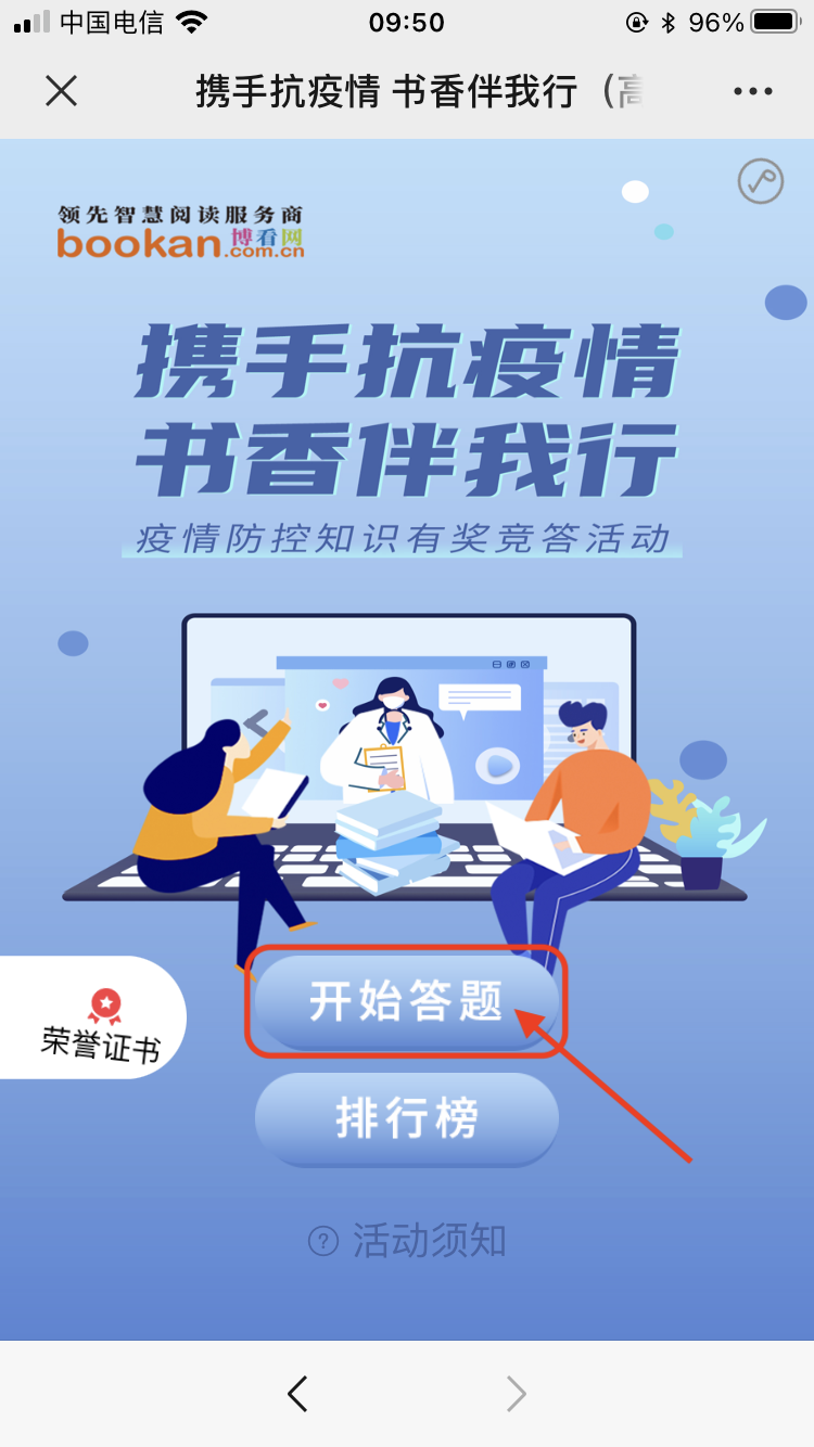 参与读者进入活动页面,按提示进入答题环节(答题范围:疫情防护、健康养生、心理健康等相关知识),完成高分挑战后,有机会抽取现金红包;连续坚持答题打卡可解锁“抗疫知识达人”荣誉称号。