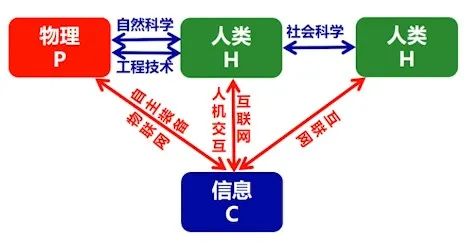 2014年我们在做智慧城市课题时发现:世界正从二元空间转为三元空间。世界原来是由人类社会空间(H)和物理空间(P)组成的二元空间。随着时间的推进,信息迅速壮长成新一极——信息空间(C)。