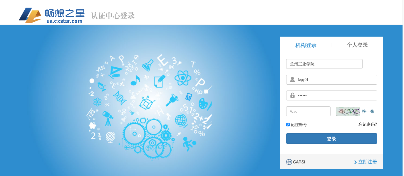 02.在机构栏输入“兰州工业学院”,用户名输入“lzgy01”,密码输入“123456”,然后输入验证码,点击“登录”;