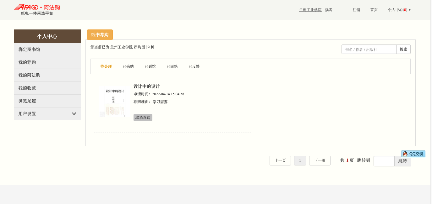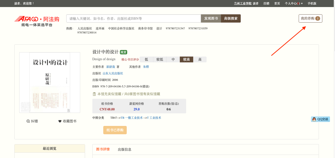 08.图书已经荐购成功,点击“我的荐购”,可以查看所有已经荐购的书籍。