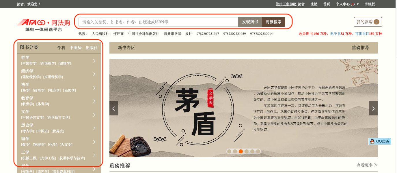 03.在主页面,可以输入关键词进行检索,也可以按照图书分类进行检索;