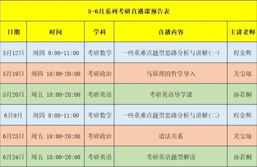 为了助力考研学子,博学易知公益考研直播课根据整年考研备考规划,全年持续更新直播课表。现将5-6月的考研直播课课表公布如下:
