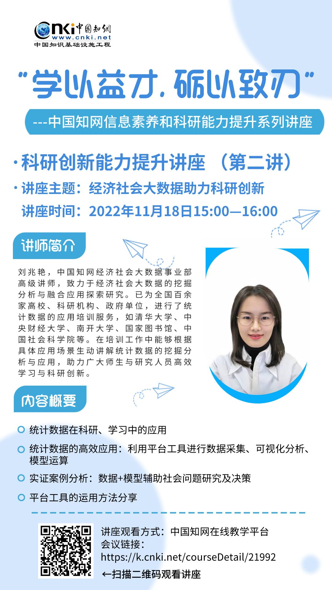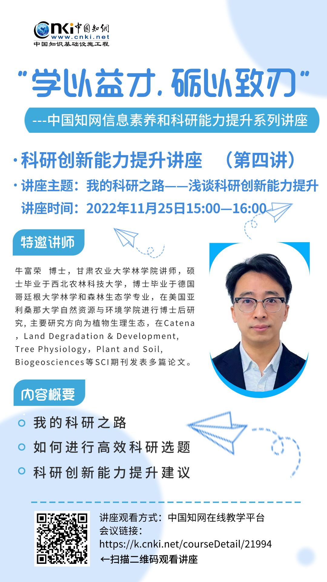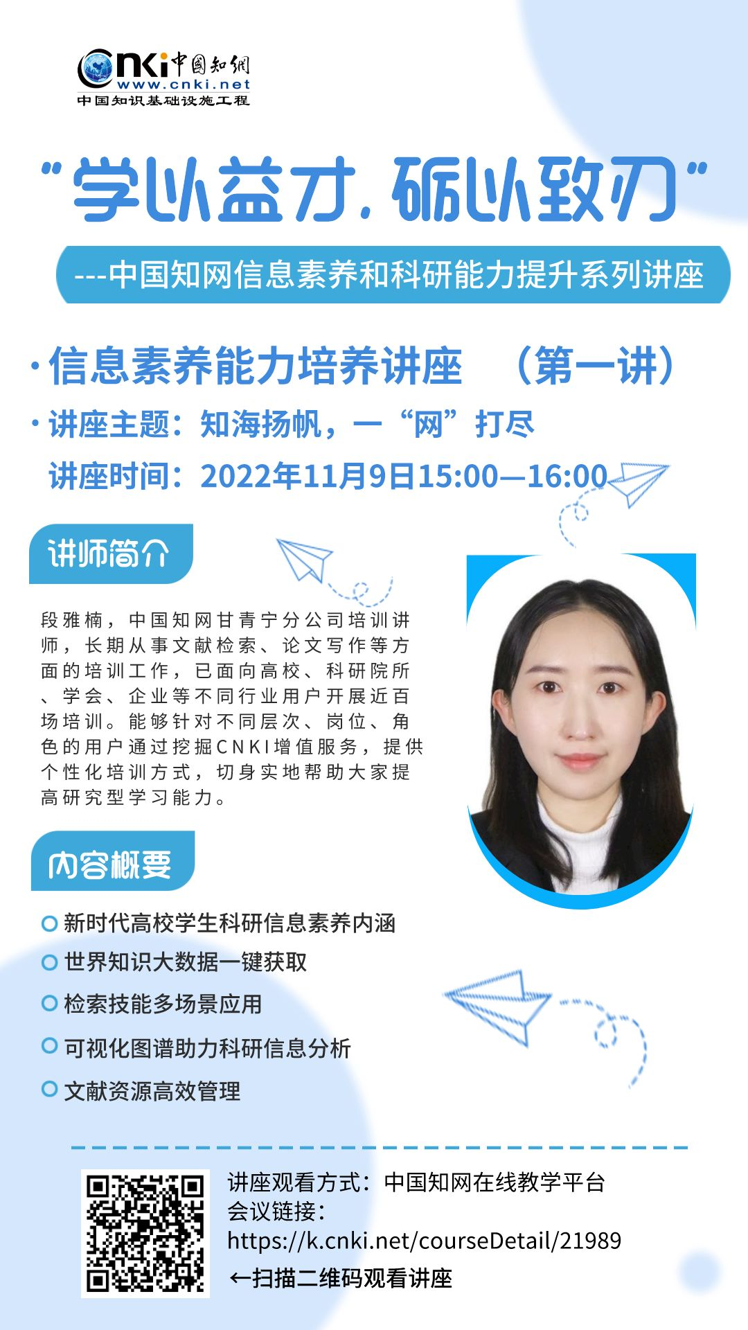 本次系列讲座全程在 知网在线教学服务平台 开展,各位同学可扫描海报中的二维码或复制链接跳转至讲座页面观看,也可关注公众号“甘青宁知网”发布的讲座预告获取更多讲座信息。