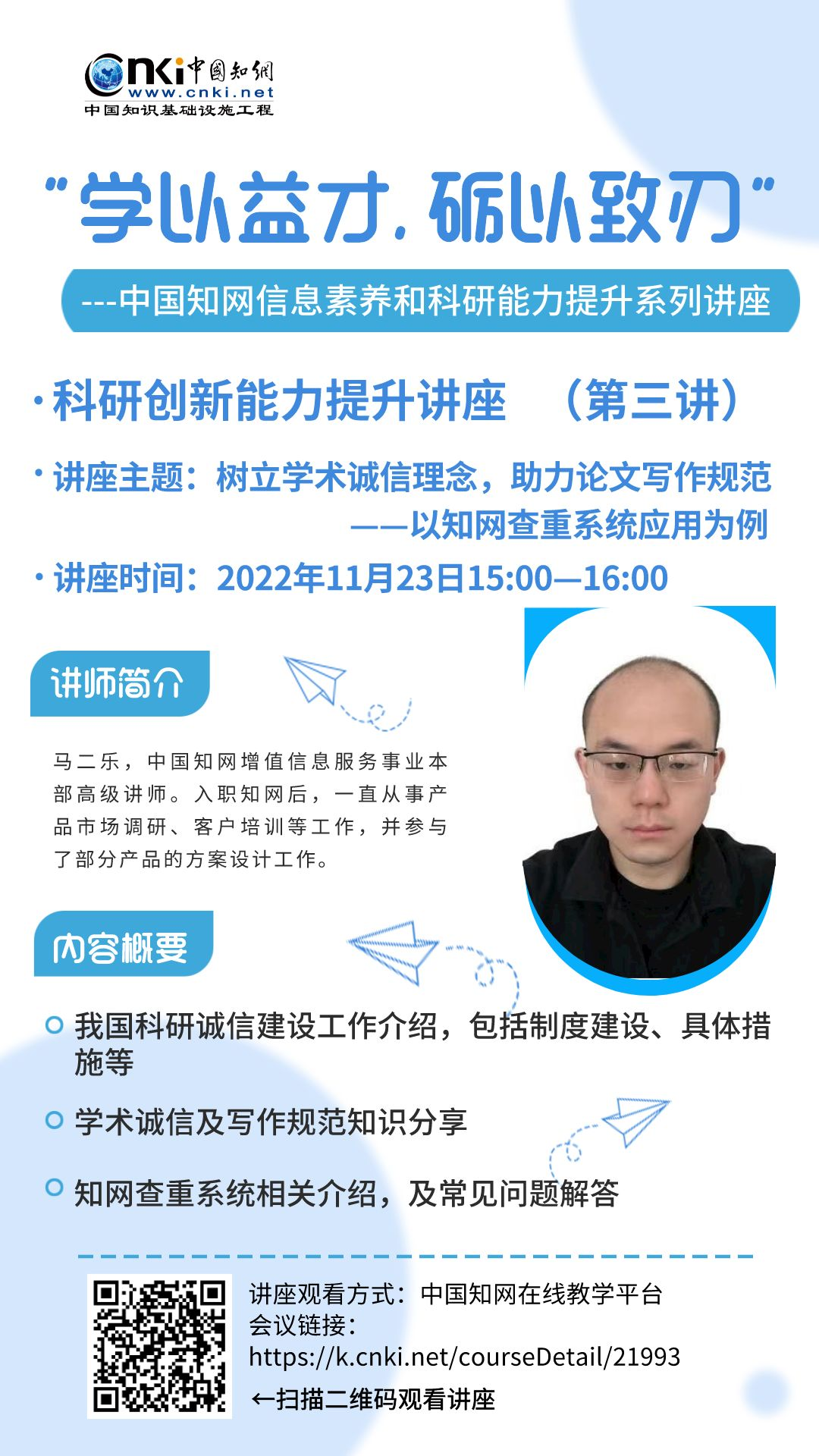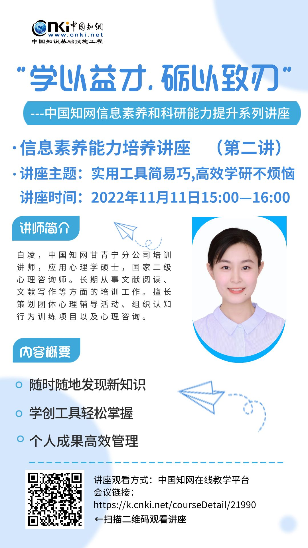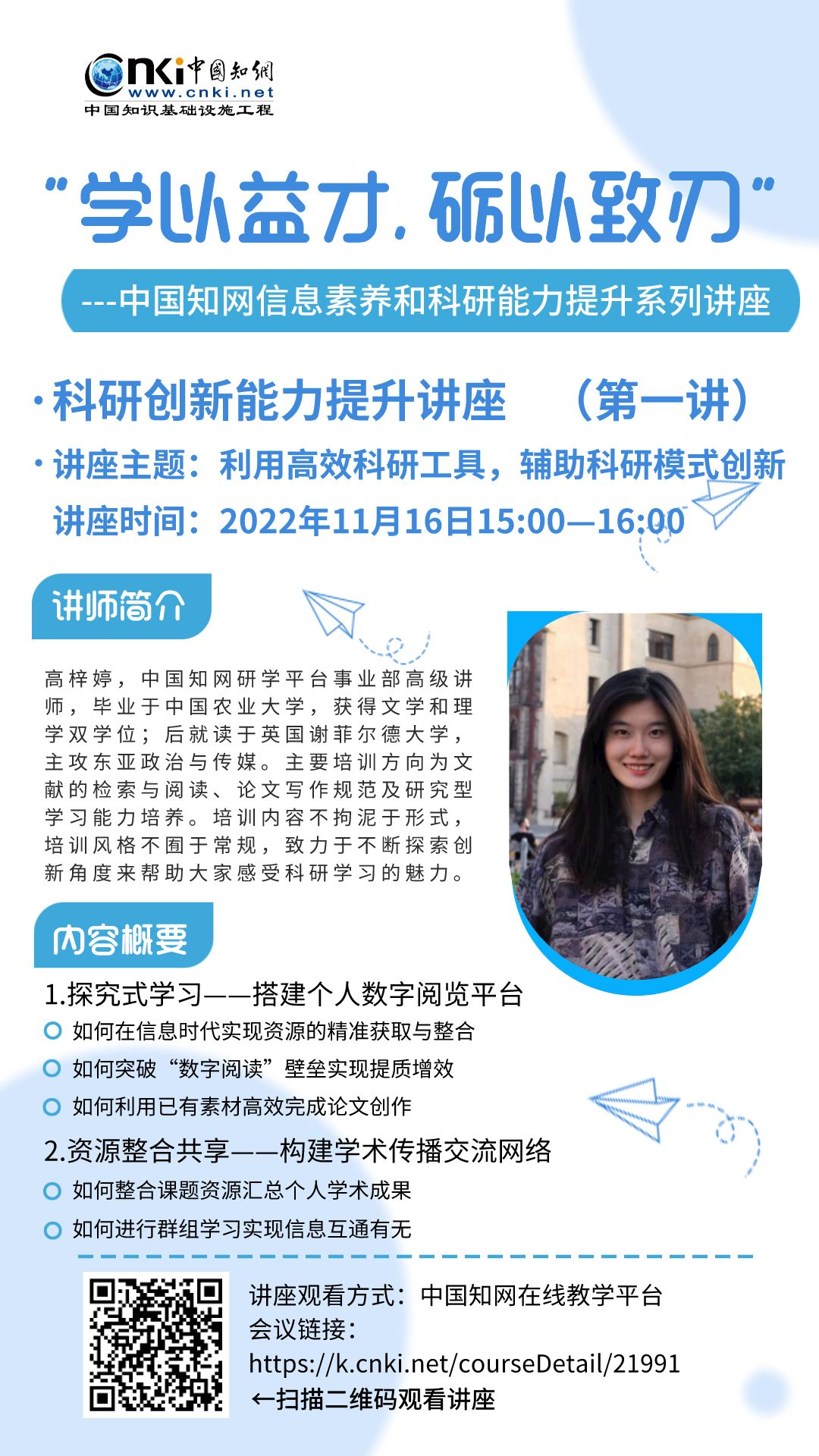 本次系列讲座全程在 知网在线教学服务平台 开展,各位同学可扫描海报中的二维码或复制链接跳转至讲座页面观看,也可关注公众号“甘青宁知网”发布的讲座预告获取更多讲座信息。