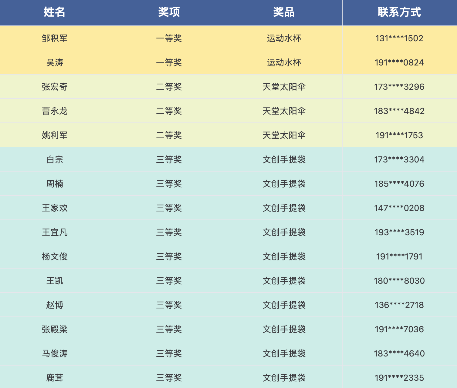 请获奖的同学和老师于2023年6月12日至6月16日上午9:00—11:30,下午2:00—4:30带身份证件或有效证件到图书馆三楼电子阅览室找宋老师领取奖品!