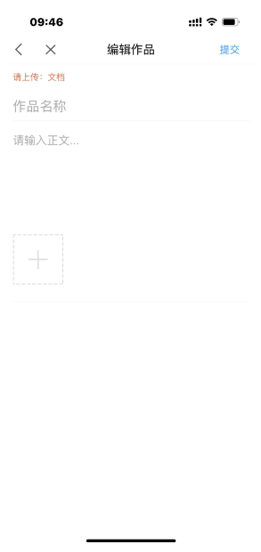 根据格式要求填写作品名称,输入正文及上传文档。