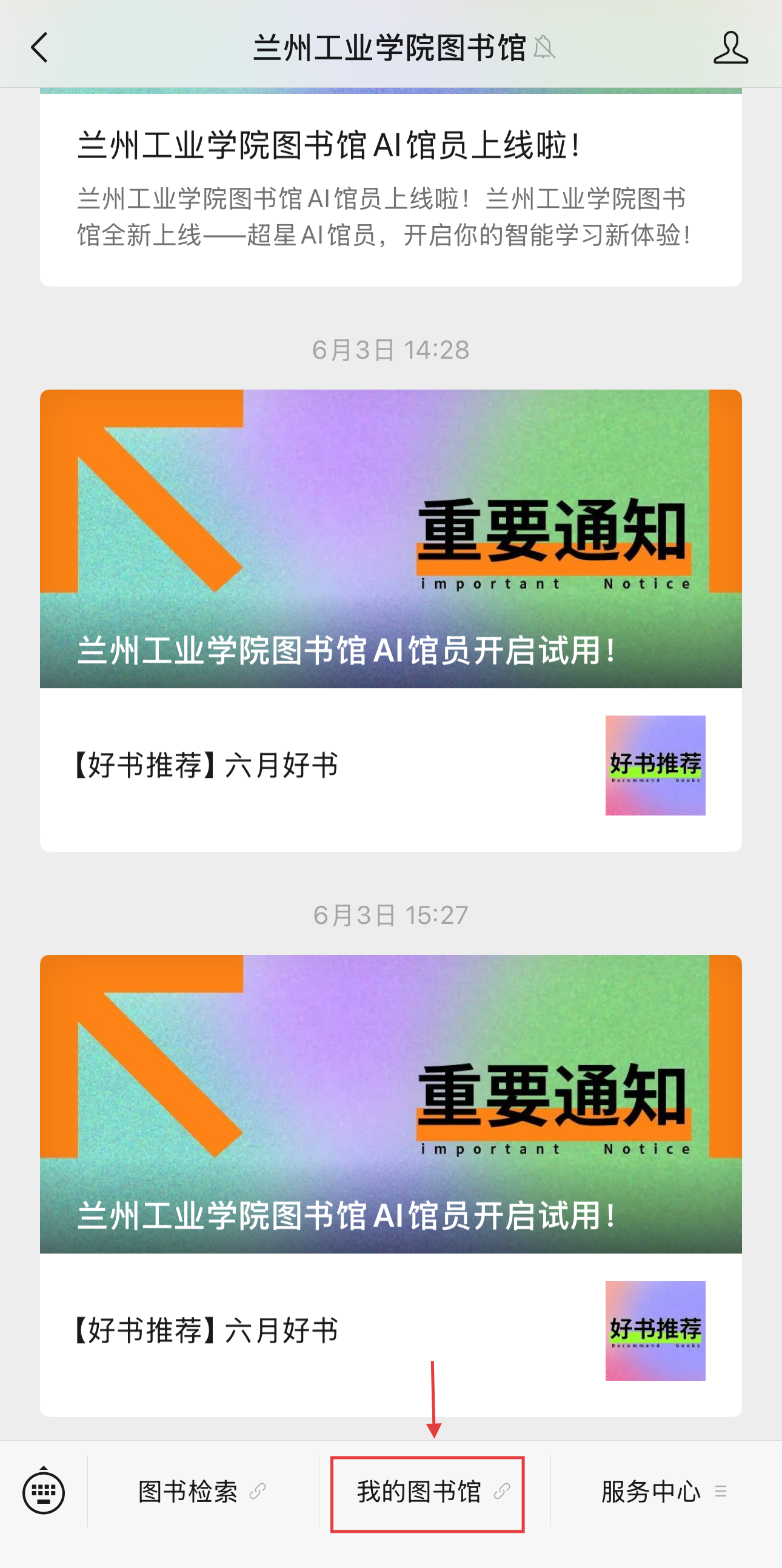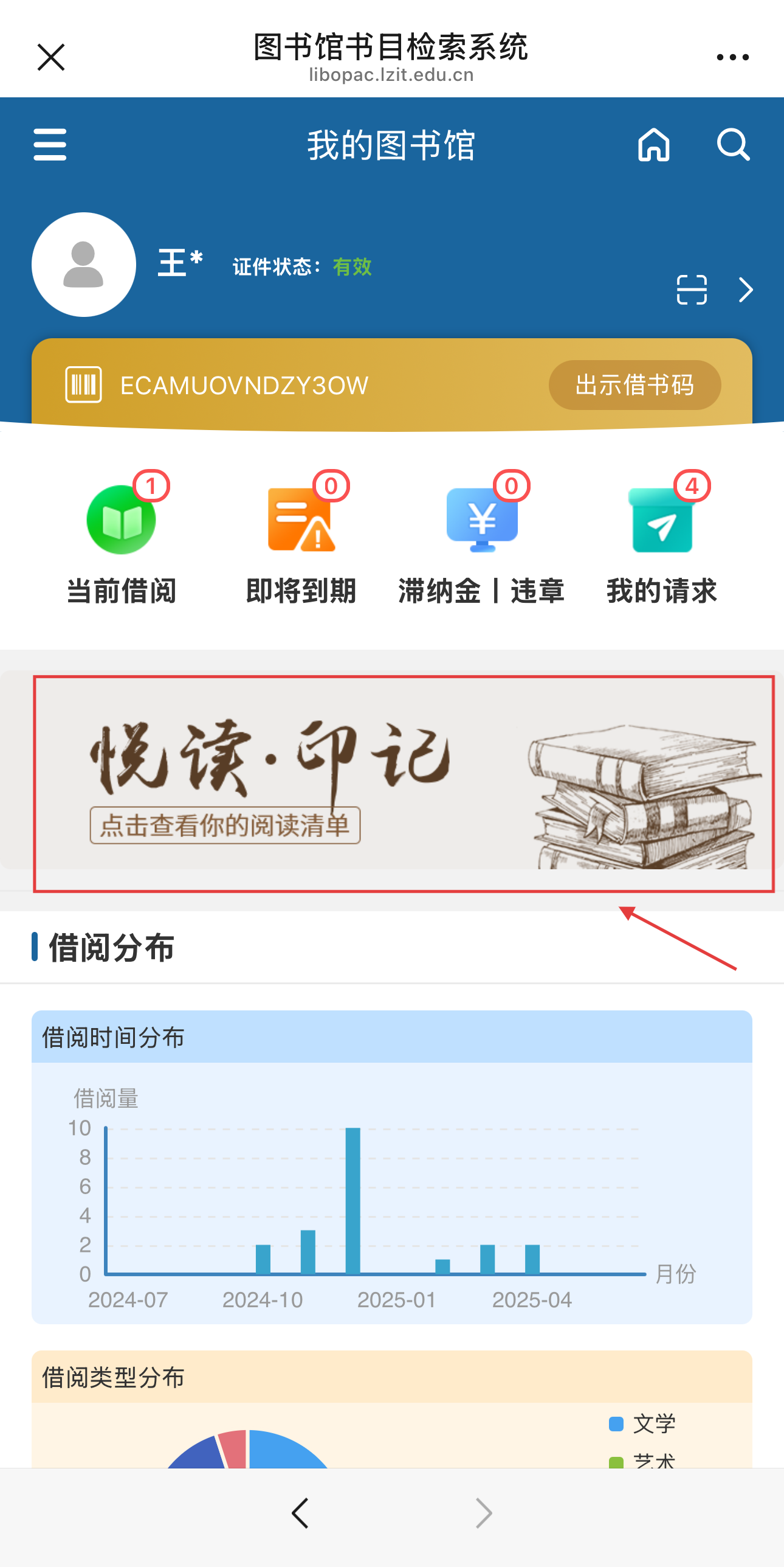2.进入兰州工业学院图书馆微信公众号——点击“我的图书馆”——选择“统一身份认证登录”——点击“悦读 印记”查看你的阅读清单。