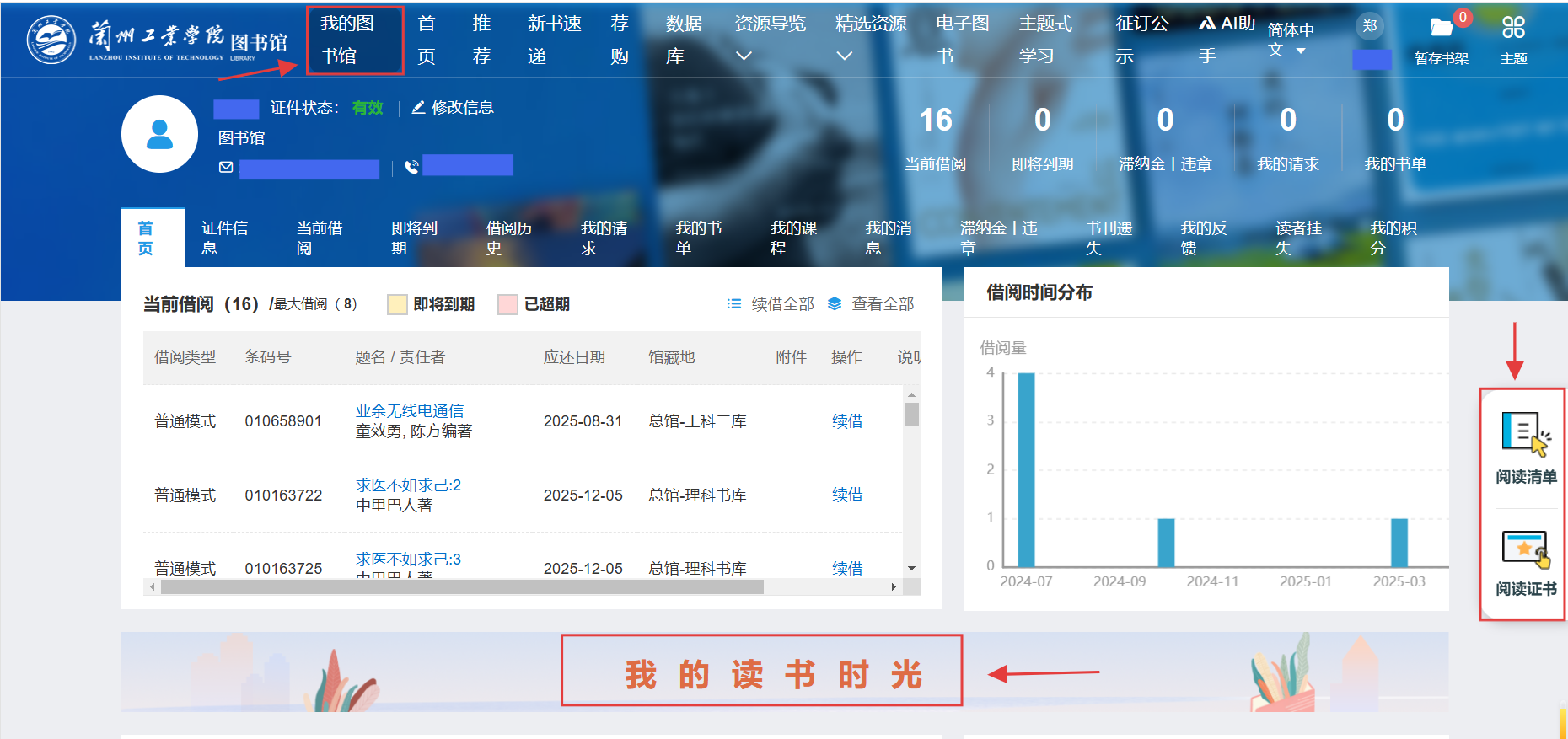 1.进入兰州工业学院图书馆主页——点击“我的图书馆”——选择“统一身份认证登录”——点击网页右侧的“阅读清单”和“阅读证书”——网页上方可选择下载、打印等。点击“我的读书时光”,还可以查看自己的阅读数据与阅读轨迹。