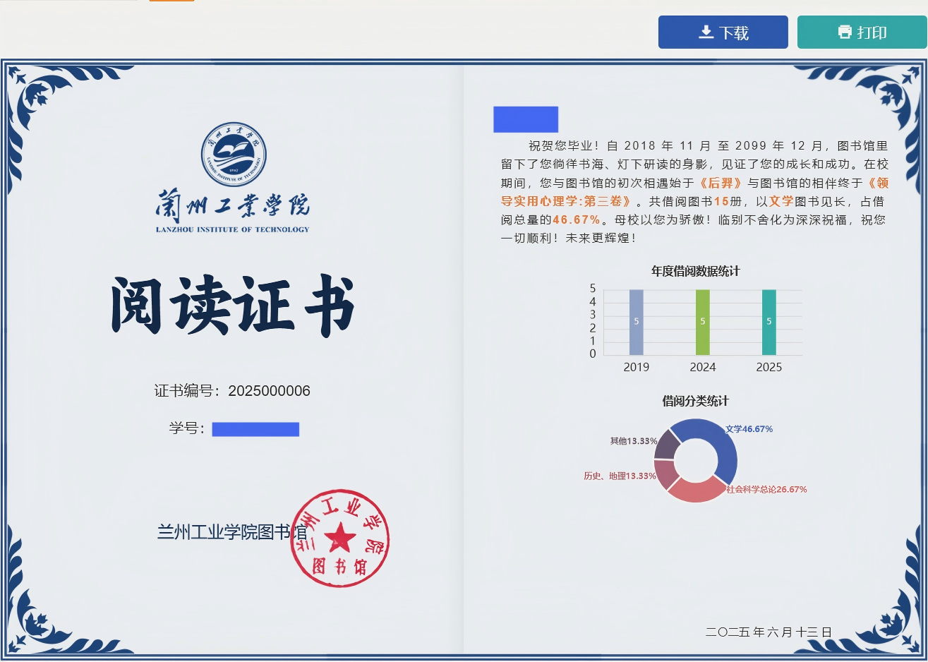 大学四年的借阅记录,串联起你完整的求学时光;每一本书的借阅轨迹,都记录着你成长蜕变的印记;读过的每本书籍,都是你获取学位的重要积累。这份阅读记录,将成为你思想成熟的珍贵见证。2025年毕业季,图书馆为毕业生特制专属礼物——“悦读印记”个人借阅清单与阅读证书,完整呈现你大学期间的全部借阅历史。这是专属你的阅读人生地图,欢迎领取这份承载青春的书香见证。