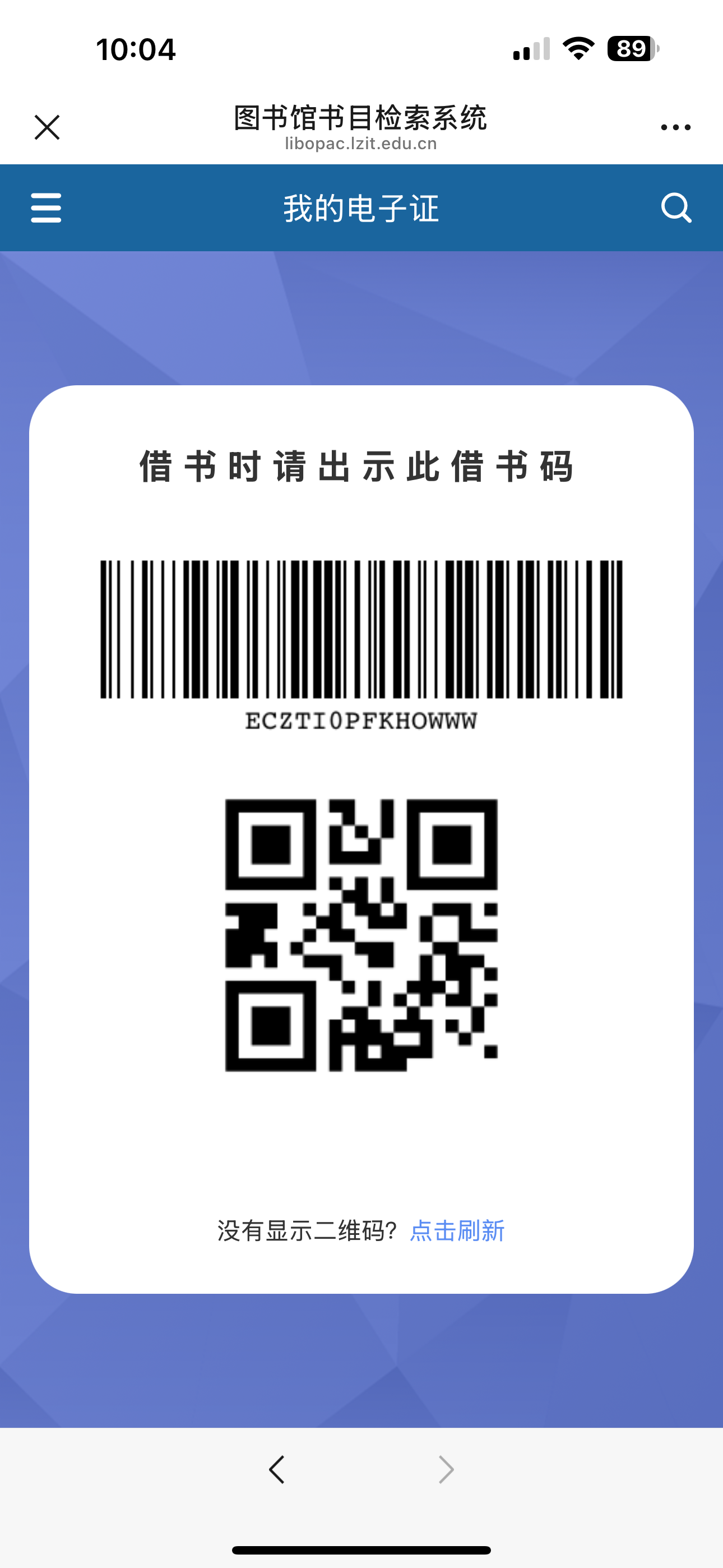 3. 点击“出示借书码”,系统将生成一个动态二维码,此二维码是读者通过闸机以及借还图书的凭证。