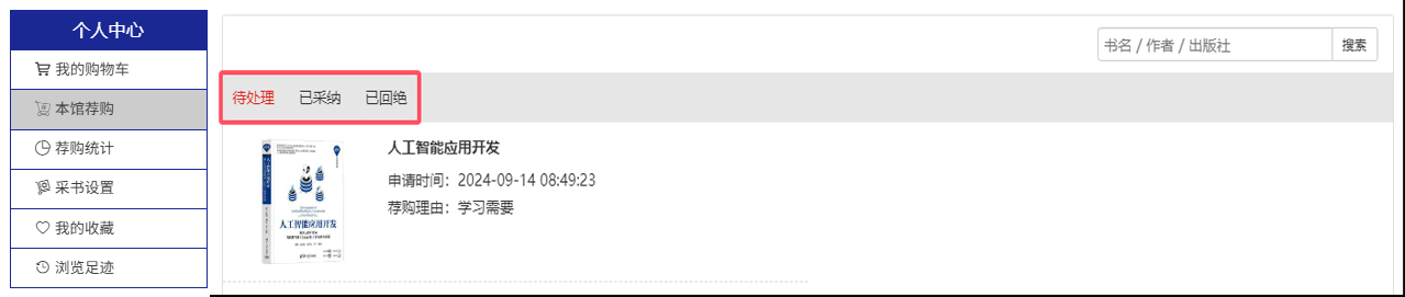 4、我的荐购:【个人中心】→【我的荐购】 中可查看到所有的荐购书目,及图书馆的采纳情况。