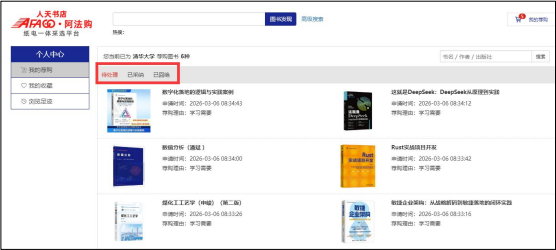 3、我的荐购:【个人中心】→【我的荐购】中可查看到所有的荐购书目,及图书馆的采纳情况。