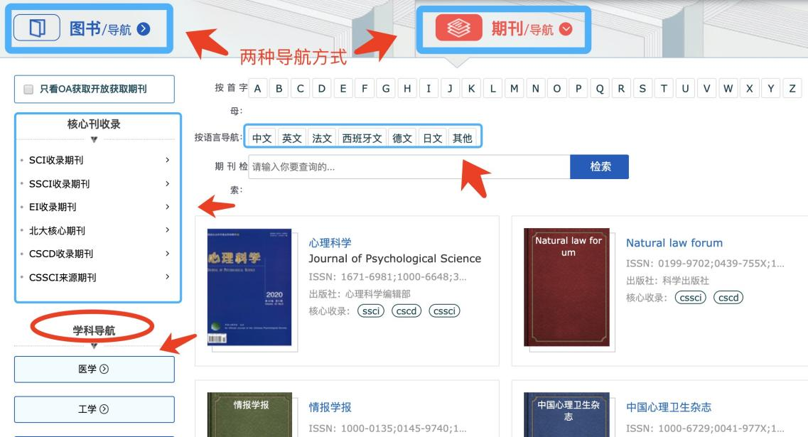 5、查看学科相关的图书、期刊列表,方便投稿能有更多期刊选择:点左顶角【导航】,即看到学科相关的图书或期刊,期刊包含sci、北大南大核心、学科、语言等多种筛选方式。
