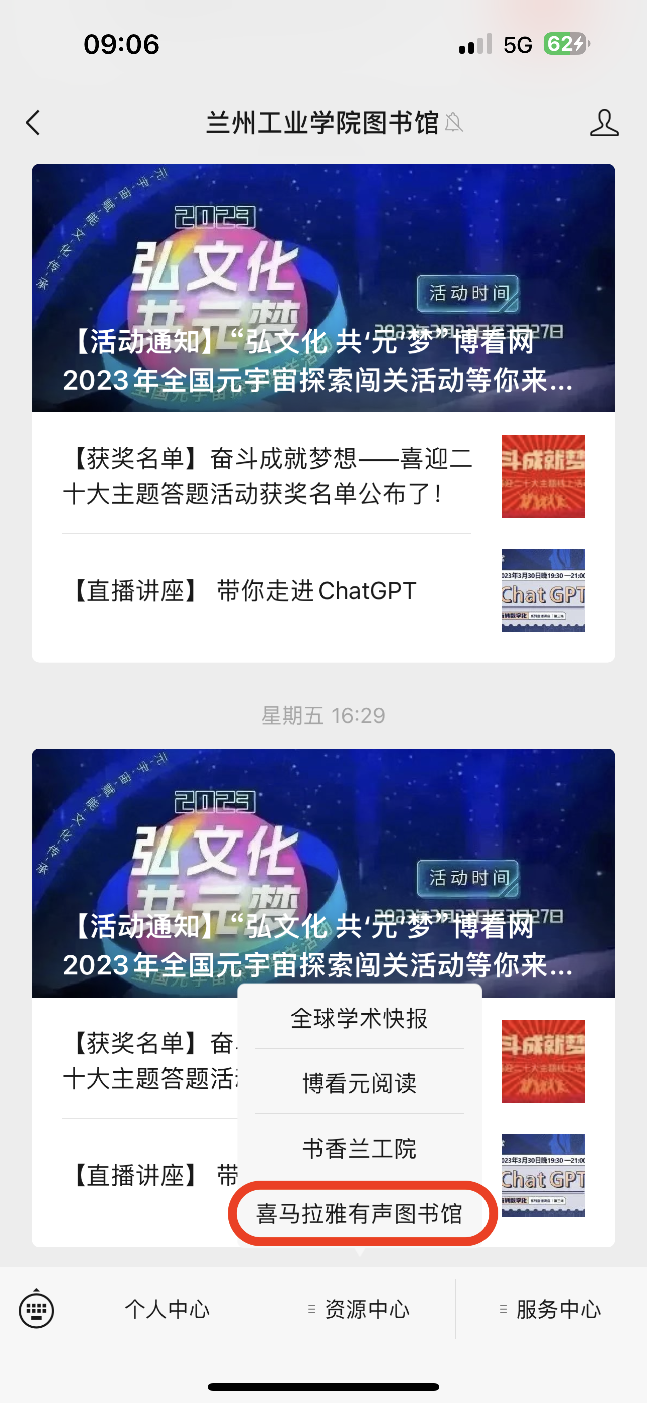 1.打开“兰州工业学院图书馆微信公众号”,点击最下方“资源中心”,然后点击“喜马拉雅有声图书馆”,进入小程序。