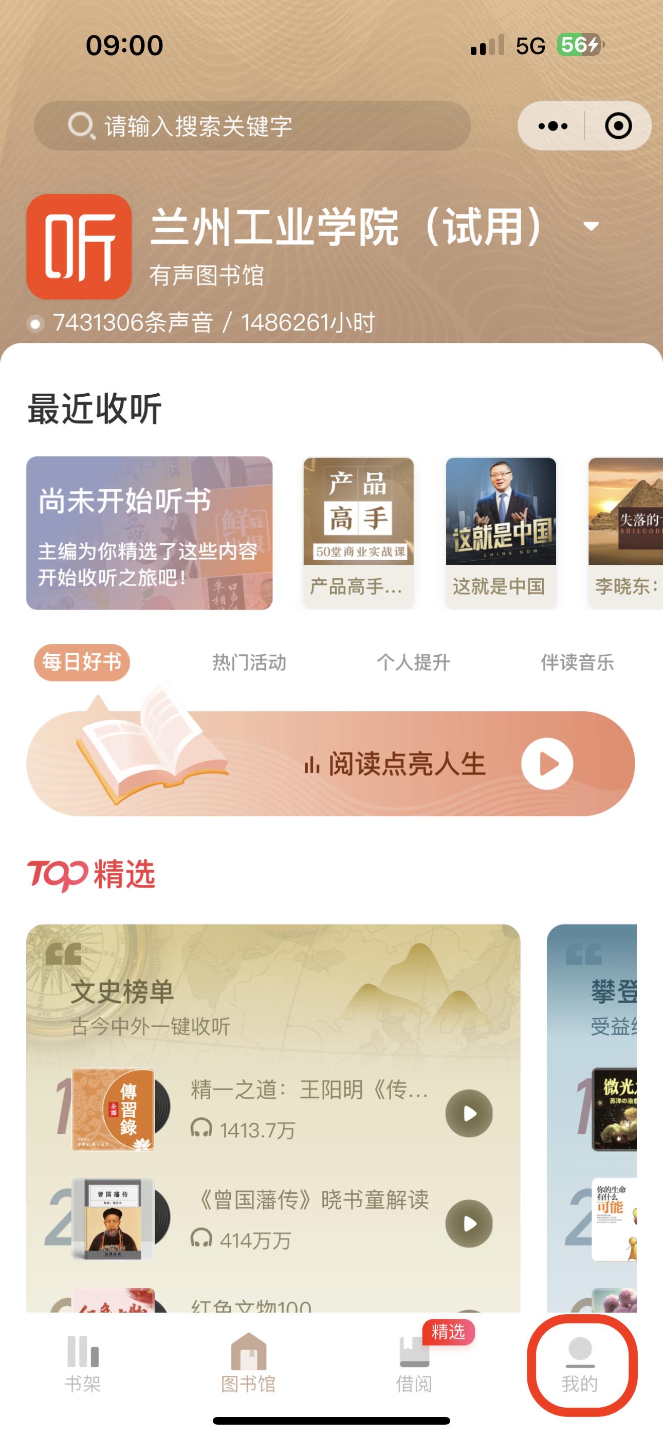 2.定位成功后,小程序最上端会出现“兰州工业学院(试用)”字样,这样小程序内的资源就都可以试用了。如果想把优质资源加入书架,方便空闲时间收听,则需要注册。点击最下方“我的”,然后按提示填入相关信息注册即可。
