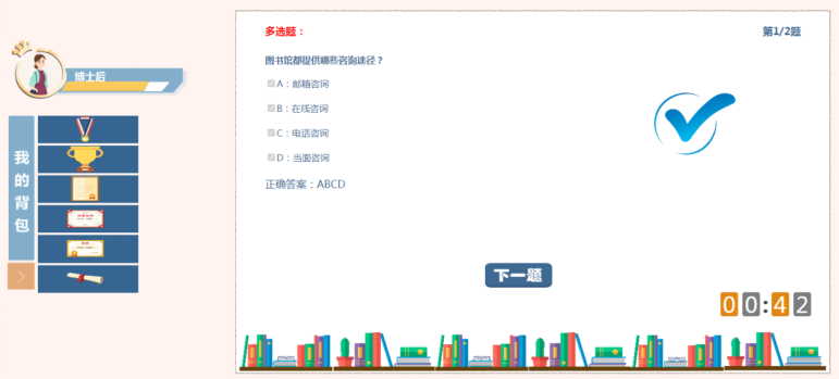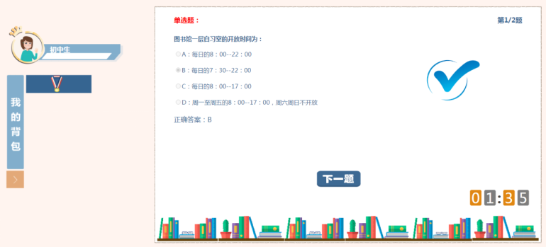 五、请同学们认真读题并作答,答错题目时,可以使用道具来重获一次答题机会,一个关卡只能使用一次道具,答错两道题目时即为闯关失败,需要重新学习本关了,顺利过关后,就会获得新的道具,通往下一关。