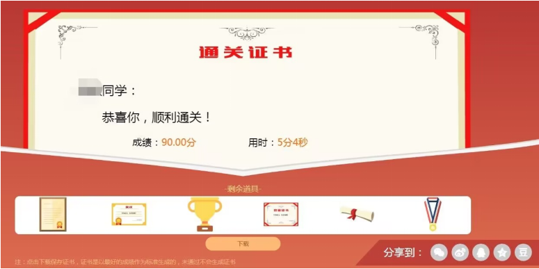 六、学习完并通过所有的知识闯关,系统会给出个人成绩,之后都可以在“个人中心”查看个人成绩和排名。