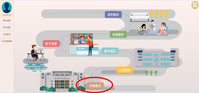 四、进入导航页,点击进入“本馆概况”,每点击进入学习一个节点,这一节点就会变暗。全部节点都变暗后,才可以点选“闯关”进行知识测试。