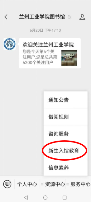 1.手机关注“兰州工业学院图书馆”微信公众号,进入微信服务栏目右下角“服务中心”→“ 新生入馆教育”,根据语音提示点击“开始”即可进行学习。